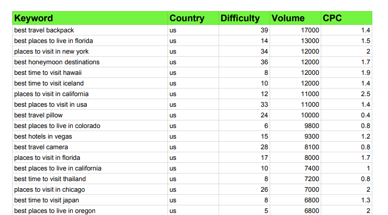 For example look at the keywords that I found in travel niche..