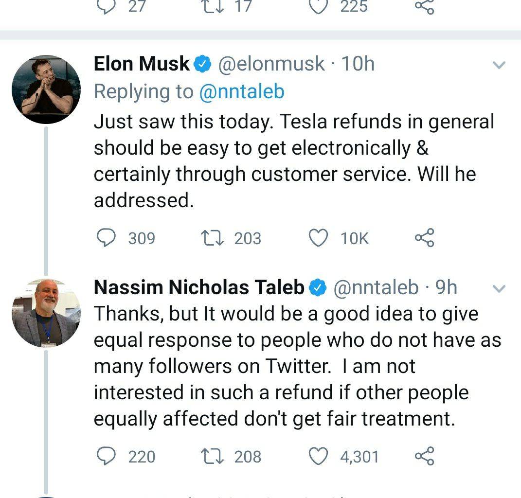 Nassim Taleb is author of finance books and ofcourse have a big followership on Twitter. Elon responsed to his complaint regarding an issue with Tesla's customer care. And ensured refund.