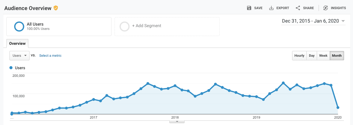 The blog traffic grew super fast in 2017 and declined by the end of 2018.