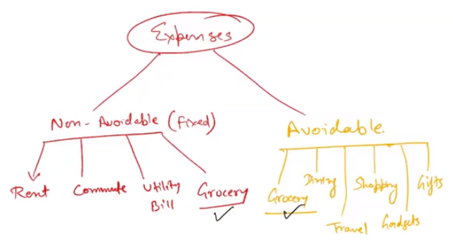 1. Non-Avoidable - Rent, daily commute, utility bills & groceries that you need for living. For example, the money you pay as rent to your landlord is unavoidable, right? because if you do not pay then he will kick you out of the house.